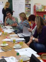 Sehr motiviert und gut vorbereitet trafen sich die Leiterinnen und ausgewählte Mitarbeiterinnen / Mitarbeiter verschiedener Einrichtungen, um die Leipziger Einrichtung näher kennenzulernen und den praktischen Erfahrungsaustausch auf pädagogischer, fachlicher aber auch organisatorischer Ebene zu praktizieren. Wie auch bei ihrer ersten Beratung fanden die Teilnehmerinnen und Teilnehmer der Zusammenkunft übergreifende Gemeinsamkeiten in Zielen und Inhalten auf der Grundlage des kreativitätspädagogischen Konzeptes. So konnte die Arbeit am Rahmenplan für den Fachbereich Sprachliches Gestalten abgeschlossen werden. Einen weiteren Schwerpunkt bildete die Verständigung über den Rahmenplan für den Fachbereich Englisch. In Orientierung an bereits vorhandene Materialien und mit strategischem Blick auf den Rahmenplan für die Klassen 1 und 2 der Grundschulen fand eine überaus konstruktive und effektive Arbeit der Teilnehmerinnen und Teilnehmer statt, sodass am Ende des Arbeitens ein gemeinsamer Plan in seiner Grundstruktur steht. Die Teilnehmerinnen und Teilnehmer waren sich einig, dass das Geschaffene noch unfertig ist. Es wird daran weiter gearbeitet werden, am 12. September 2014 in Neubrandenburg, und sie alle wollen und werden aktiv mitwirken.
